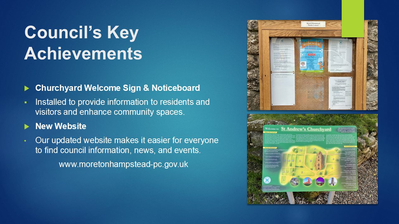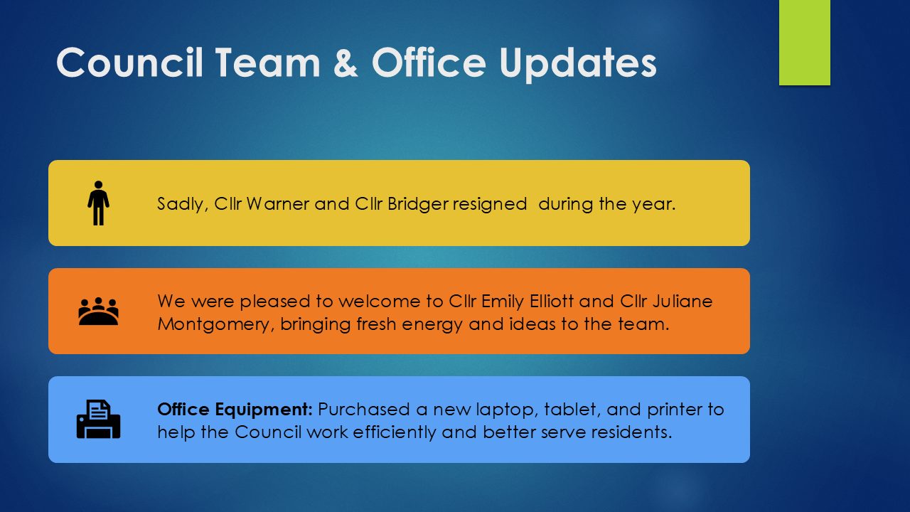 We were delighted to welcome representatives from the Swimming Pool, Community Speedwatch, Carnival Committee, MED Theatre, Twinning Association, Community Shed, PCSO Wilson, County Councillor Richard Keeling, District Councillor John Farrand‑Rogers, the Neighbourhood Highways Officer and the DNPA Ranger. Their displays and conversations helped make the event both informative and engaging.